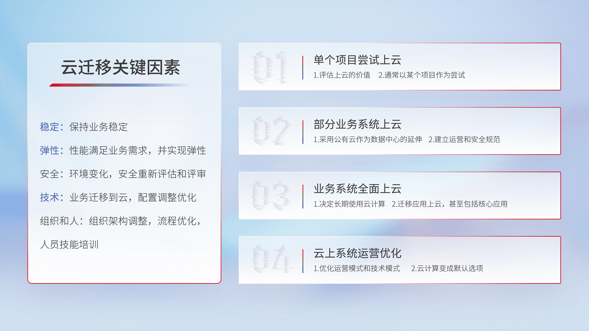 结合实际业务,,,,从规划设计、、云平台选型、、、云原生改造、、、、数据迁移、、、集成交付,,,迁移全过程为客户识别最佳上云路径,,做好风险识别管理,,,设计网络架构、、、身份权限、、、、安全审计合规、、操作审计、、、、日志审计、、监控告警策略、、多站点容灾设计等,,,,对云上基础设施进行整体规划,,,提升IT治理水平,,,,以满足弹性、、、高可用、、、、高性能的需求。。