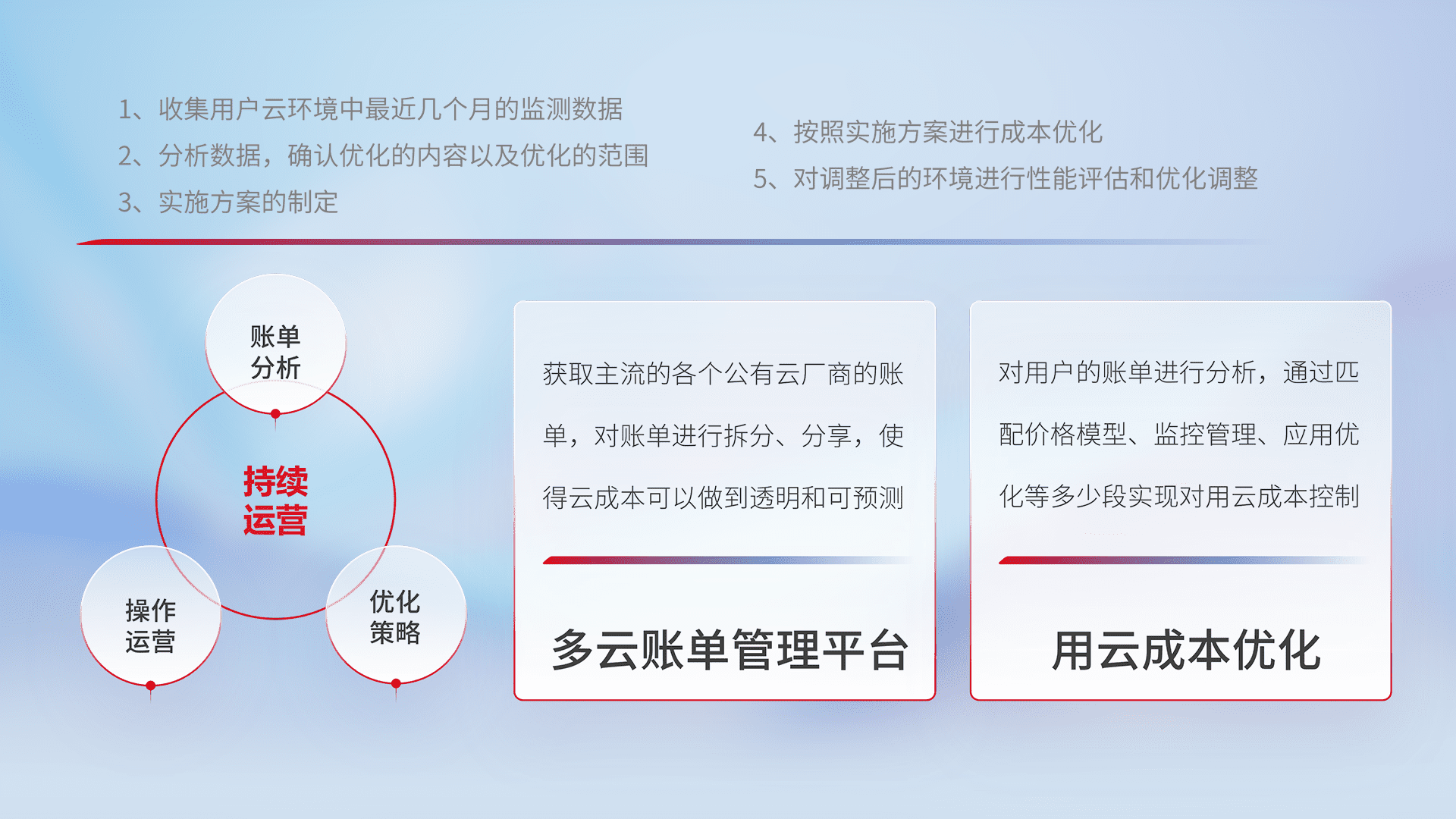 通过多云纳管,,以统一的资源数据模型把客户的云资源进行抽象和封装,,,,进而实现对多云资源的统一操作,,保障云资源管理的可靠性、、稳定性与可用性。。。量身定制化运维内容,,,配置、、、、开发运维、、、补丁管理、、、备份、、监控、、、、认证和访问管理、、、、审计和日常巡检等,,,保障在用云过程中的可靠度,,,稳定度以及高可用率。。。